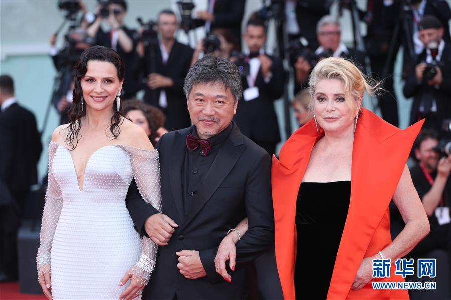 8月28日,在意大利威尼斯,開幕影片《真相》導(dǎo)演是枝裕和(中)攜主演朱麗葉·比諾什(左)與凱瑟琳·德納芙亮相開幕式紅毯。新華社記者 程婷婷 攝