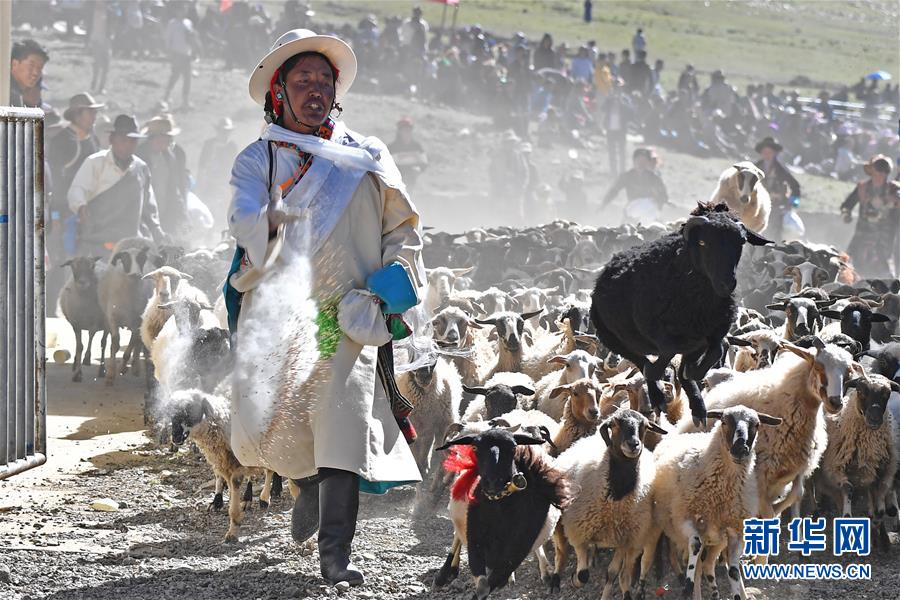 9月9日,羊群在進(jìn)入場地時(shí)牧民撒青稞祈福。李鑫 攝