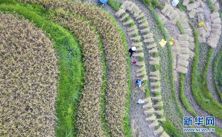 9月17日,貴州省榕江縣計劃鄉(xiāng)計劃村陽開苗寨的村民在收割稻谷(無人機拍攝)。新華社記者 楊文斌 攝