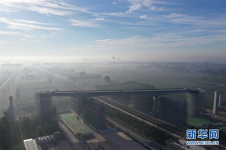 這是8月27日晨無人機拍攝的轉(zhuǎn)體完成的橋梁。新華社記者邢廣利攝