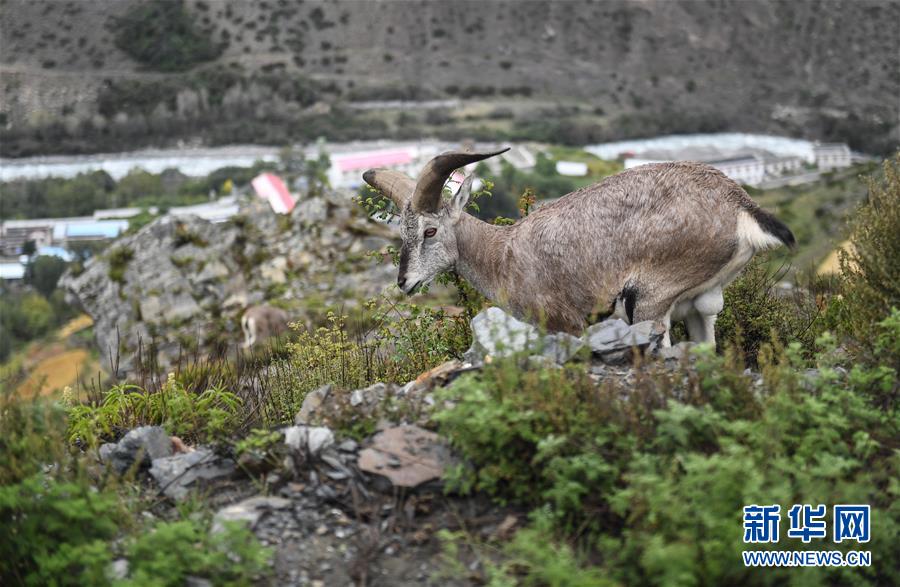 一只巖羊在西藏山南市洛扎縣色鄉(xiāng)海拔4000米左右的盤山路邊,悠閑地吃著野果青草(9月22日攝)。新華社記者 晉美多吉 攝
