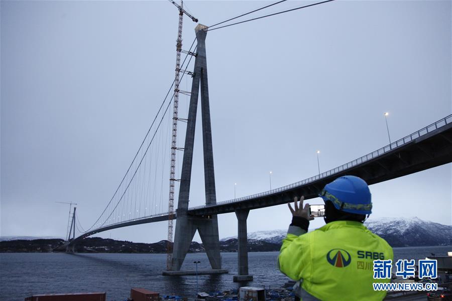 2018年12月9日,一名中國工人拍攝挪威哈羅格蘭德大橋。由中國四川公路橋梁建設(shè)集團(四川路橋)承建的挪威第二大橋哈羅格蘭德大橋位于挪威北部港口城市納爾維克附近,橋長1533米,是北極圈內(nèi)最大跨徑懸索橋。該橋縮短了從納爾維克前往特羅姆瑟、哈爾斯塔等地的路程。新華社記者梁有昶攝