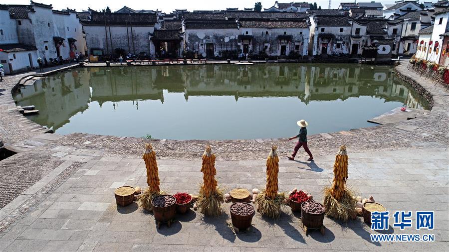 10月5日,新葉古村內(nèi)的“曬秋”美景(無人機拍攝)。新華社記者徐昱攝