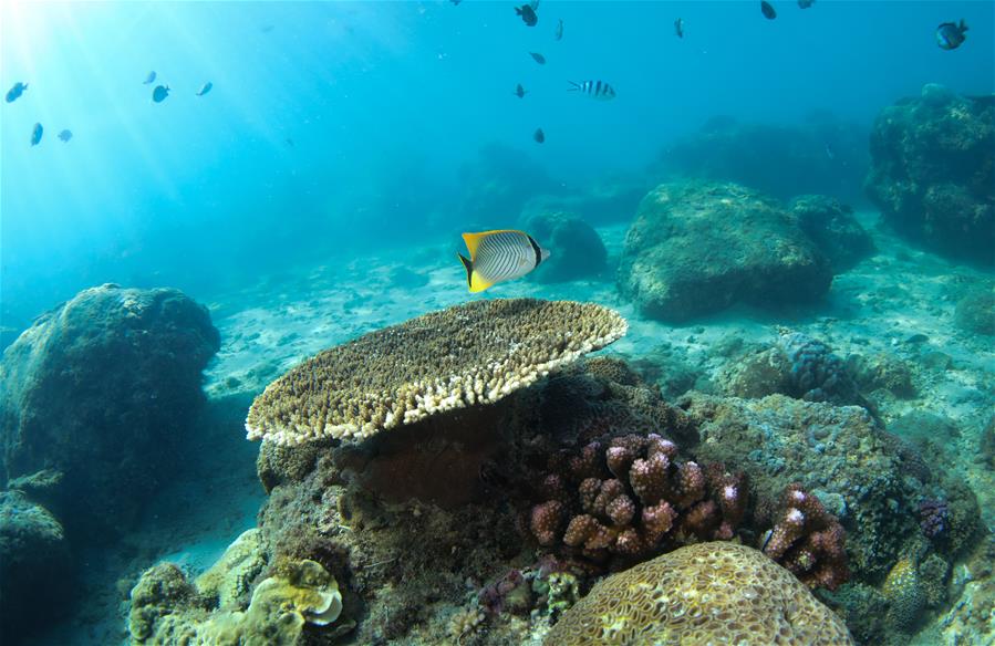 10月5日,在分界洲島海域,魚兒在珊瑚附近游動(dòng)覓食。新華社記者楊冠宇攝