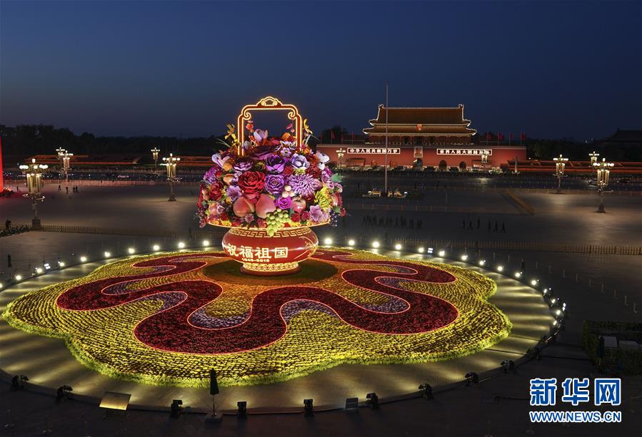 這是10月14日拍攝的天安門廣場中心花壇。 10月14日,以“花果籃”為主造型的天安門廣場中心花壇吸引了眾多游客參觀拍照。“花果籃”的夜景更是流光溢彩,絢爛迷人。 新華社記者 殷剛 攝