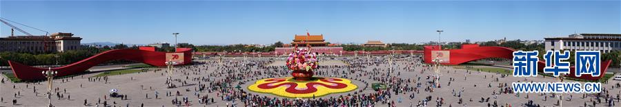 這是10月14日拍攝的天安門廣場中心花壇(全景拼接圖片)。 10月14日,以“花果籃”為主造型的天安門廣場中心花壇吸引了眾多游客參觀拍照?!盎ü@”的夜景更是流光溢彩,絢爛迷人。 新華社記者 殷剛 攝