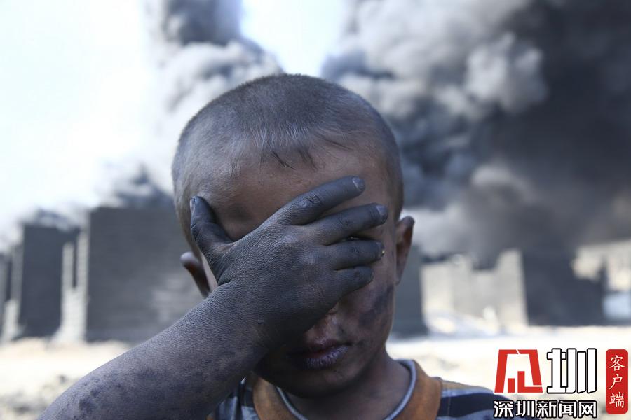 當(dāng)?shù)貢r(shí)間2016年10月25日,伊拉克摩蘇爾,遭伊斯蘭國(guó)縱火的油井冒出濃濃黑煙,嚴(yán)重影響了鎮(zhèn)子里的生活,孩子們的手和臉都被熏黑了。伊拉克政府軍于10月16日正式展開(kāi)收復(fù)摩蘇爾的戰(zhàn)役。