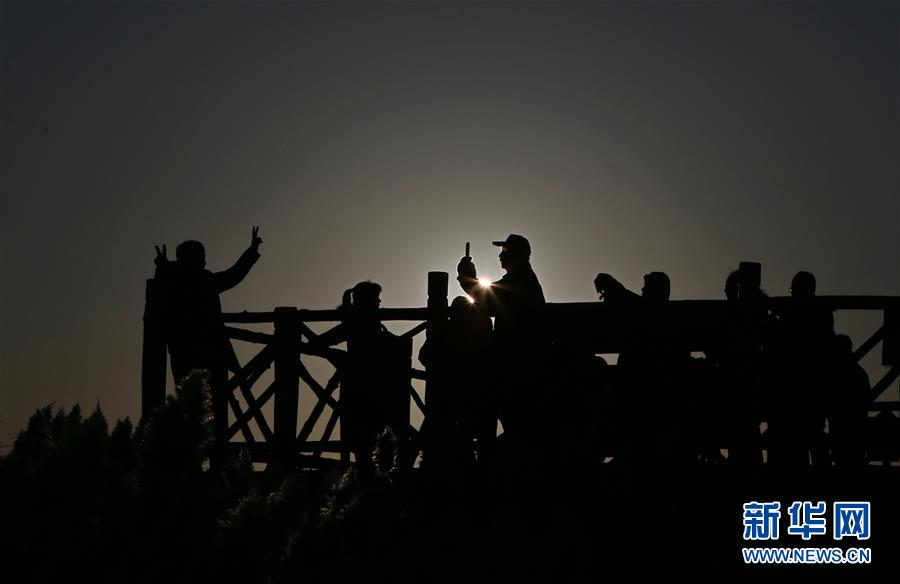 10月17日,游客在居延海岸邊的木棧道上觀(guān)賞水鳥(niǎo)。新華社記者 彭源 攝