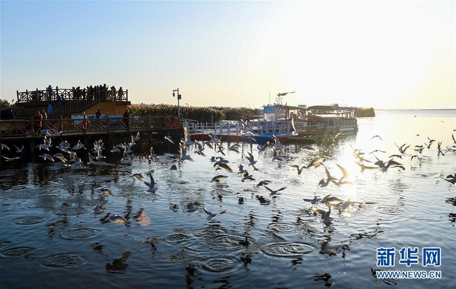 10月17日,游客在居延海岸邊的木棧道上給水鳥(niǎo)喂食。 新華社記者 彭源 攝