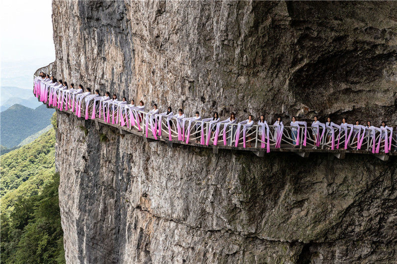 2018年7月29日,水袖舞愛(ài)好者在重慶市南川區(qū)金佛山絕壁棧道上“秀”水袖舞。瞿明斌/視覺(jué)中國(guó)