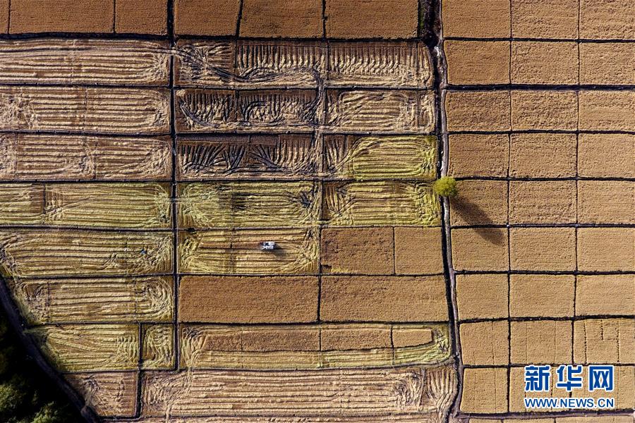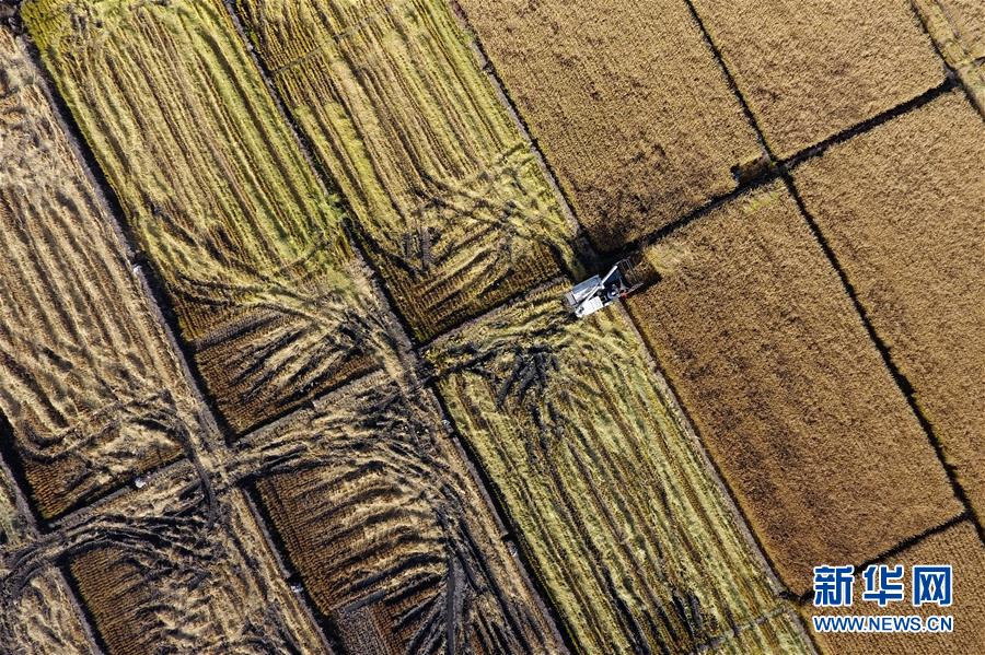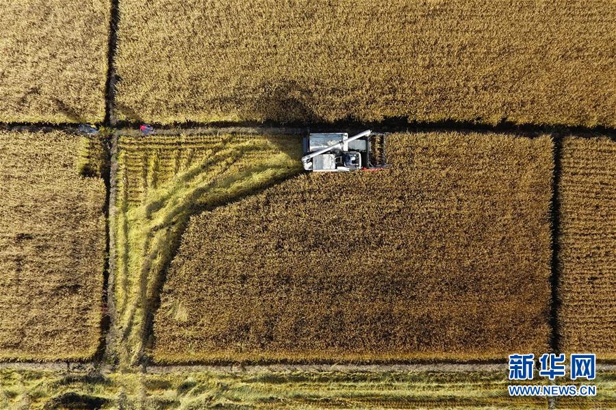 在太原市晉源區(qū)赤橋村,收割機在稻田里作業(yè)(10月28日無人機拍攝)。新華社記者詹彥攝