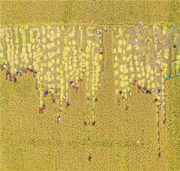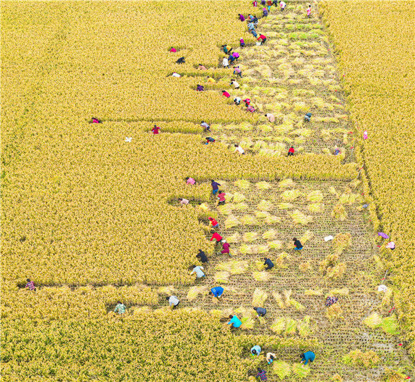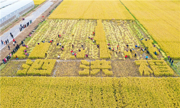 2019年10月26日,江蘇省宿遷市泗洪縣在稻米小鎮(zhèn)石集鄉(xiāng)舉行具有地方特色的割稻比賽,近60名選手在金色稻田揮舞銀鐮、緊張角逐。