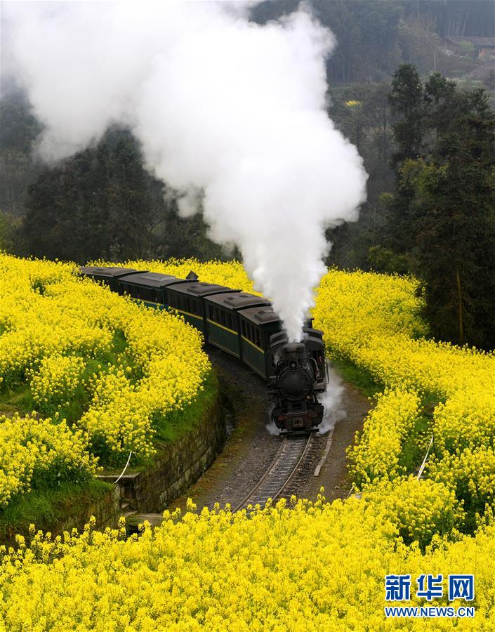3月20日,一列嘉陽(yáng)小火車在油菜花叢中穿行。