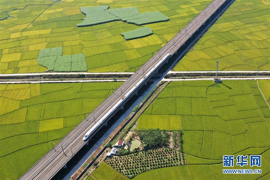 10月29日,列車(chē)從廣西賓陽(yáng)縣古辣鎮(zhèn)豐收的稻田間駛過(guò)(無(wú)人機(jī)拍攝)。新華社記者陸波岸攝