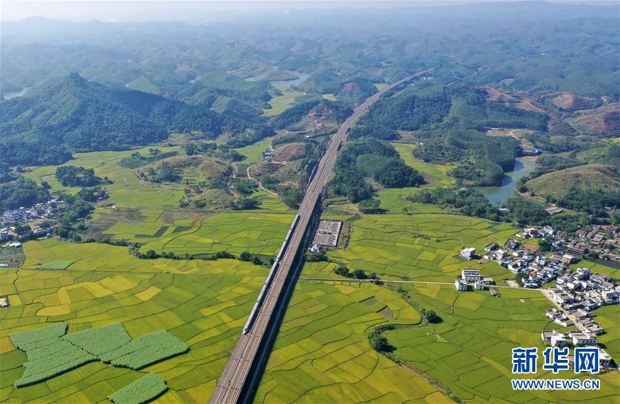 10月29日,列車從廣西賓陽縣古辣鎮(zhèn)豐收的稻田間駛過(無人機拍攝)。新華社記者陸波岸攝