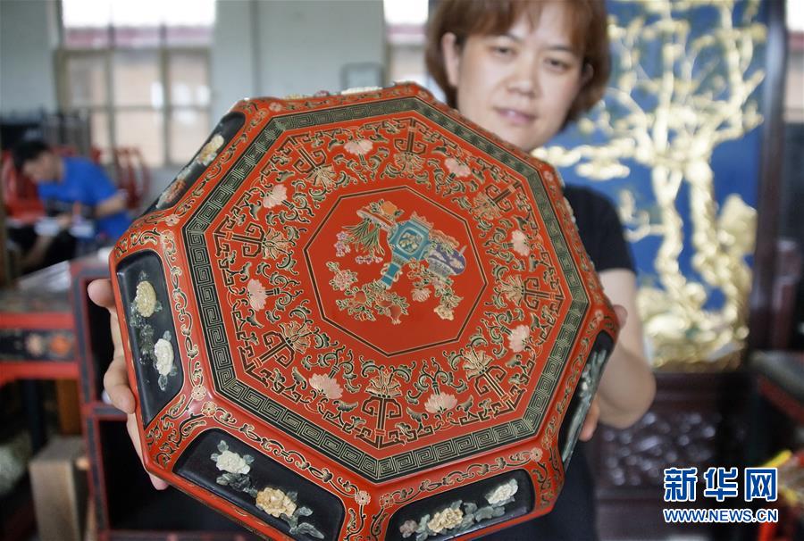 北京金漆鑲嵌有限責(zé)任公司技師在展示金漆鑲嵌技藝制作的盒子(10月31日攝)。新華社記者李欣攝