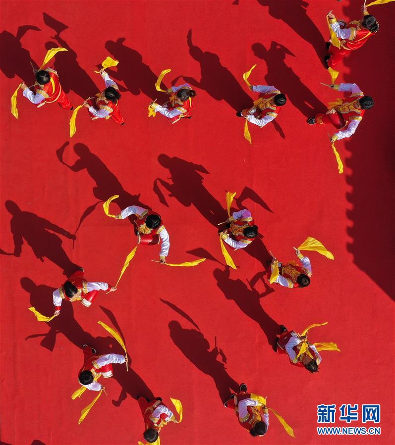11月2日,南京仙林街道仙林新村社區(qū)居民腰鼓隊(duì)在千家宴上表演助興(無人機(jī)拍攝)。 新華社記者 季春鵬 攝