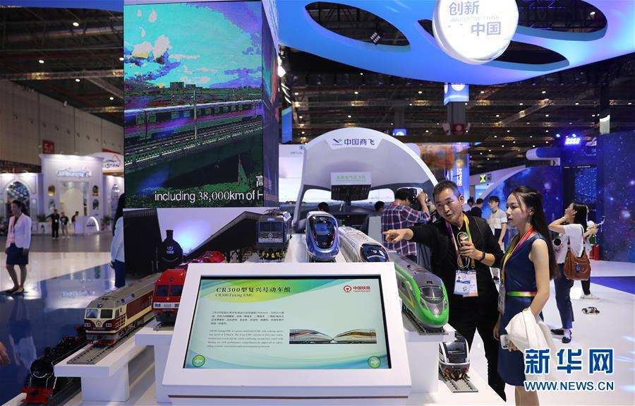 11月2日,在第二屆中國國際進口博覽會國家展展區(qū)內(nèi)的中國館,工作人員在一組中國鐵路展品旁討論交流。 新華社記者 方喆攝