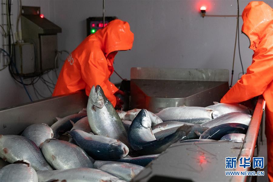 9月13日,在俄羅斯摩爾曼斯克,俄羅斯水產(chǎn)養(yǎng)殖公司工作人員在車間處理鮭魚。 新華社記者白雪騏攝