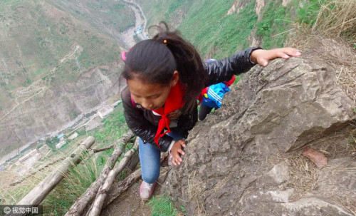 村里通向外界,需要順著懸崖斷續(xù)攀爬17 條藤梯,其中接近村莊的幾乎垂直的兩條相連的藤梯長度約100 米,沒有藤梯的崖壁才是最危險的。據(jù)支爾莫鄉(xiāng)黨委書記阿皮幾體講,他知道的在這條路上摔死的人有七八個,有村里的人,也有外來的人,而摔傷的人更多。 圖片來源:視覺中國