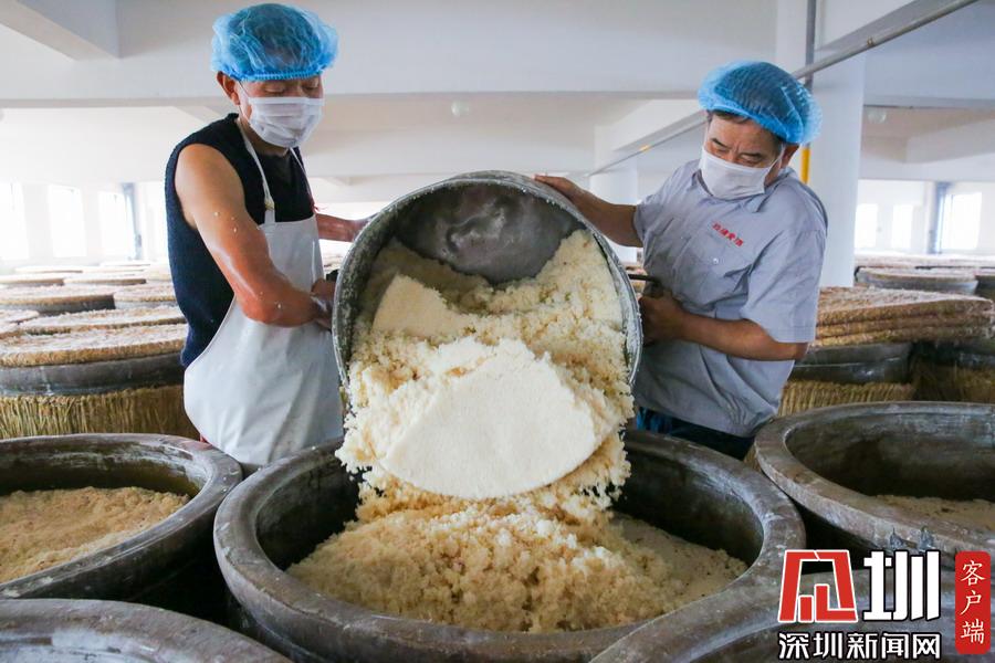 2019年11月13日,江蘇省如皋市白蒲鎮(zhèn)一釀酒廠,工人在進行二次喂飯工藝操作。