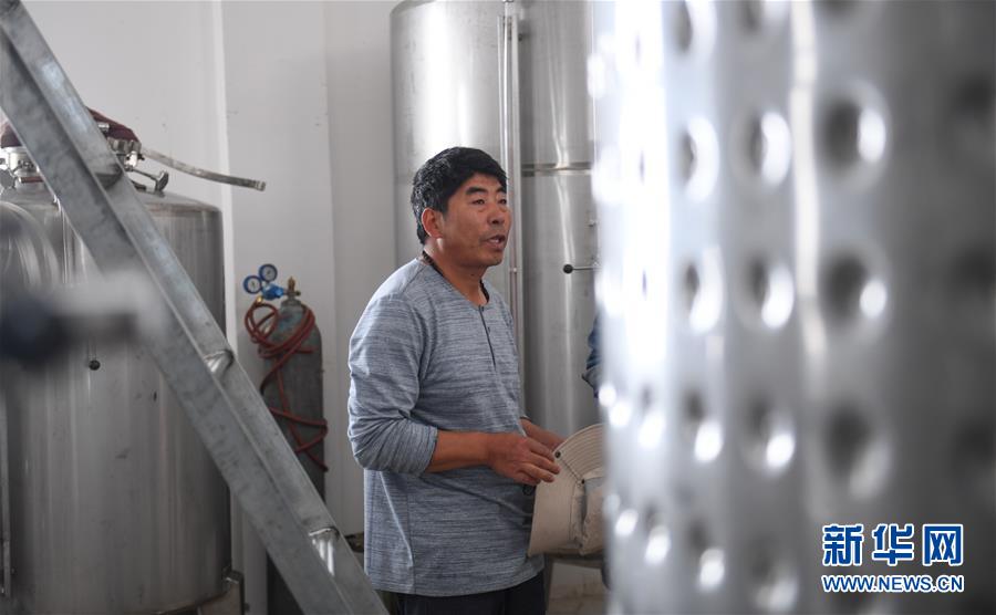 建廠生產并注冊“丁德良”牌干紅葡萄酒品牌的魯仁弟在他的酒廠里(6月3日攝)。新華社記者晉美多吉攝