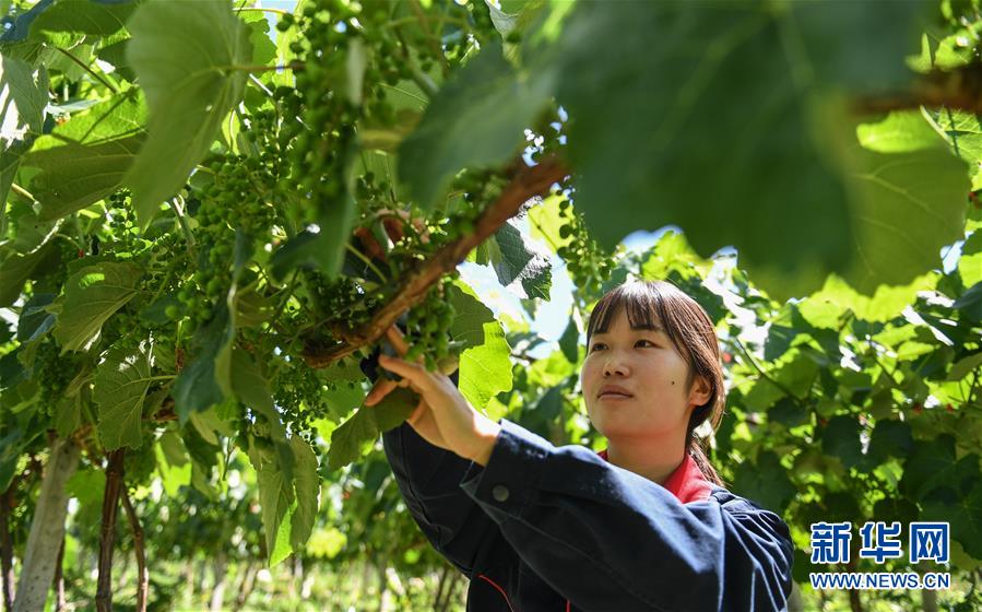 西藏芒康縣藏東珍寶酒業(yè)有限公司工人在為葡萄剪枝(6月3日攝)。新華社記者晉美多吉攝