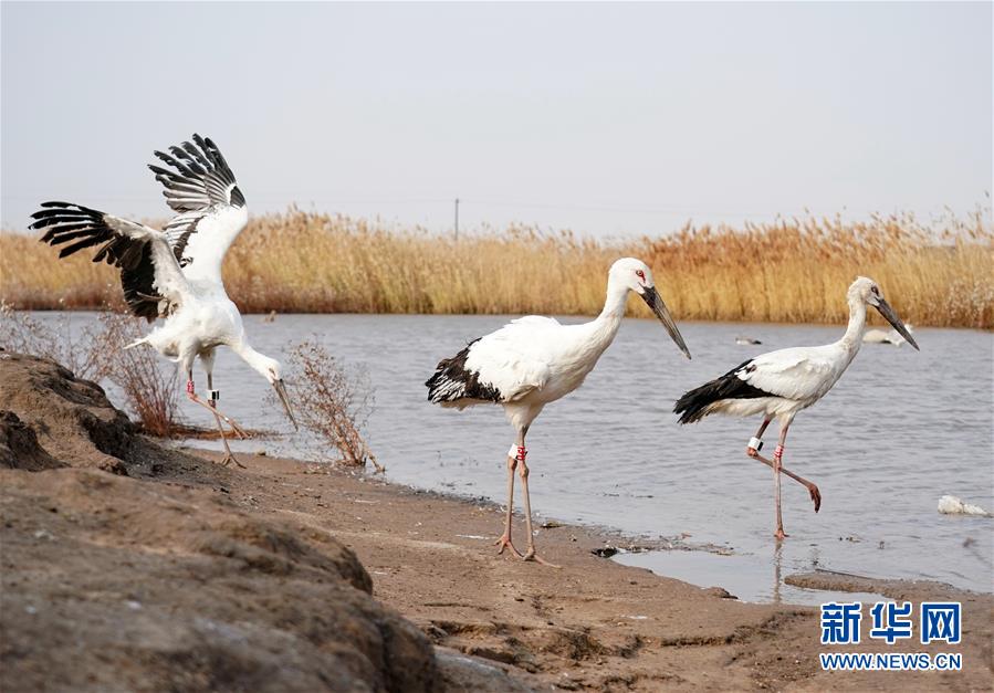 這是在樂亭縣野生動物保護(hù)協(xié)會大清河鳥類救助站放飛回歸大自然的三只國家一級保護(hù)動物東方白鸛(11月16日攝)。新華社記者楊世堯攝