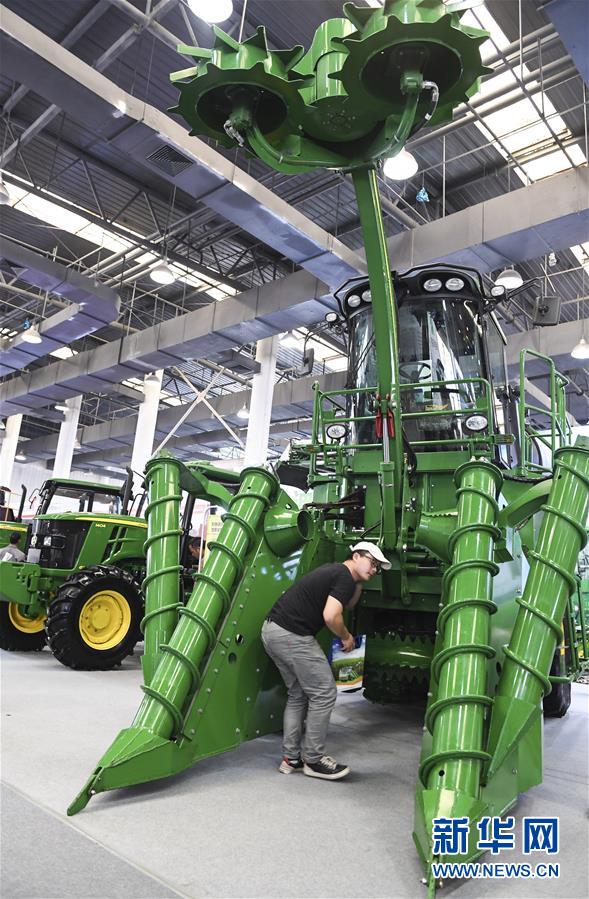 11月16日,參觀者在展會現(xiàn)場參觀甘蔗收割機(jī)械設(shè)備。新華社記者曹祎銘攝