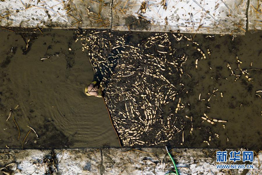 2月1日,在雄安新區(qū)安新縣東向陽村的一處藕塘,一名挖藕工將挖出來的藕推向塘邊(無人機航拍)。新華社記者沈伯韓攝