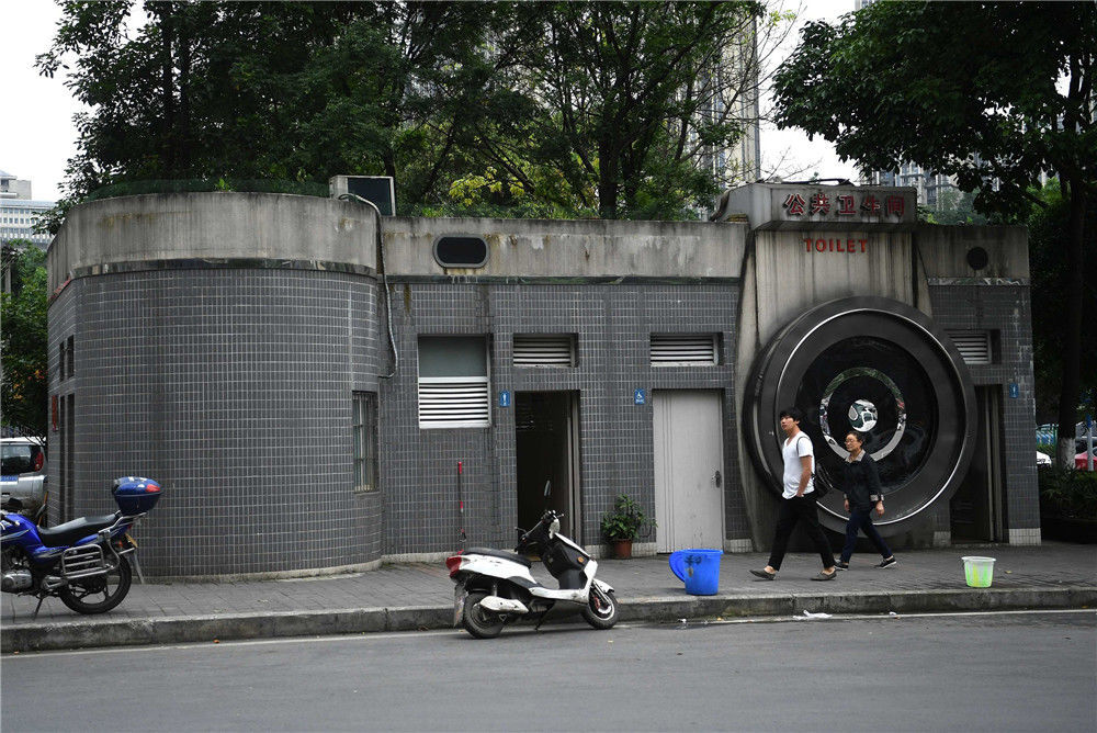2017年5月5日,重慶,市民經(jīng)過街頭創(chuàng)意“照相機(jī)”廁所都會(huì)駐足觀看。以“照相機(jī)”外形來修建的公共衛(wèi)生間,成為一道創(chuàng)意城市風(fēng)景線。徐勇/視覺中國(guó)
