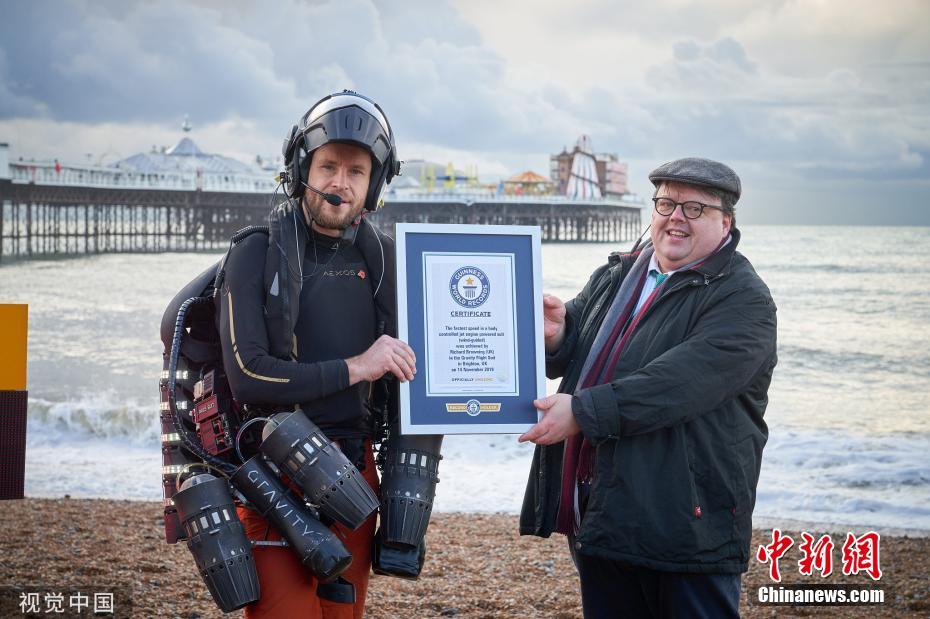 11月18日訊,英國布萊頓,英國發(fā)明家理查德·布朗寧穿著一套由身體控制、噴氣發(fā)動機驅(qū)動、風(fēng)力導(dǎo)向的飛行服,以高達每小時85.06英里(約137公里)的飛行速度,打破了自己創(chuàng)下的噴氣式飛行服速度的吉尼斯世界紀錄。圖為工作人員為理查德·布朗寧頒獎。圖片來源:視覺中國