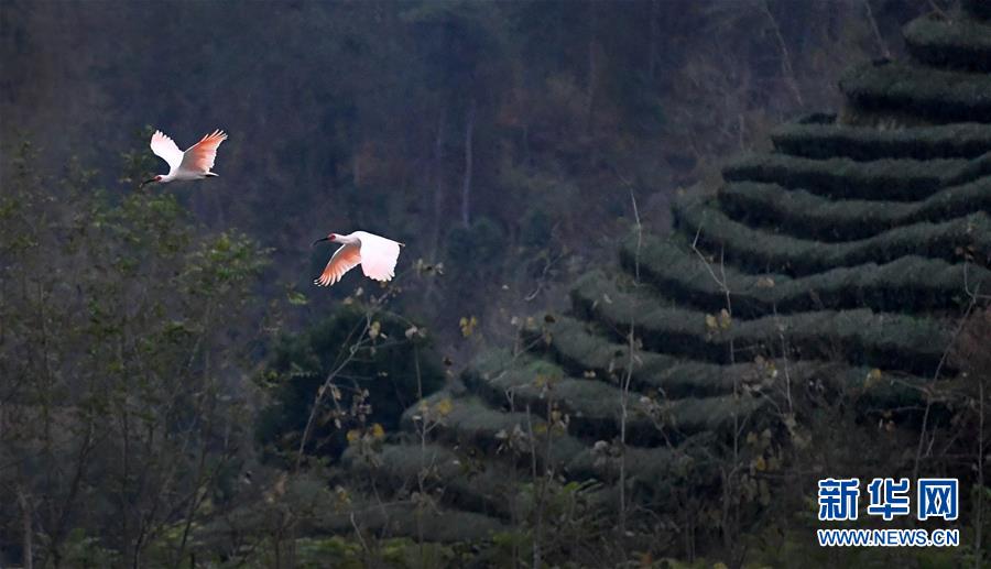 11月19日,朱鹮飛翔在陜西省漢中市西鄉(xiāng)縣峽口鎮(zhèn)牧馬河上空。 新華社記者陶明攝