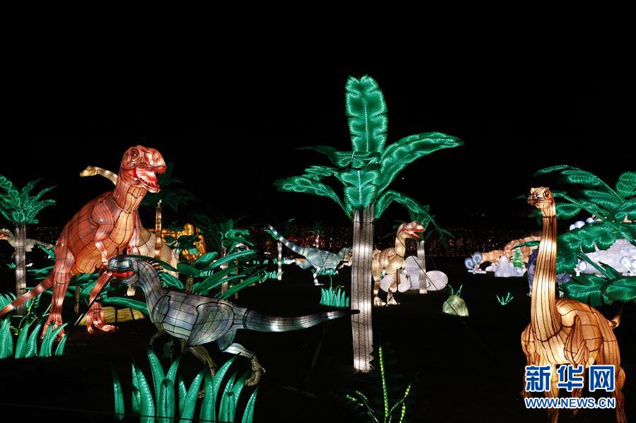 這是11月20日在美國(guó)紐約斯塔滕島第二屆紐約花燈游園會(huì)上拍攝的恐龍花燈。當(dāng)日,第二屆紐約花燈游園會(huì)在美國(guó)紐約斯塔滕島開幕,50余組各類花燈照亮夜空,吸引觀眾前來賞燈游玩。新華社記者李木子攝