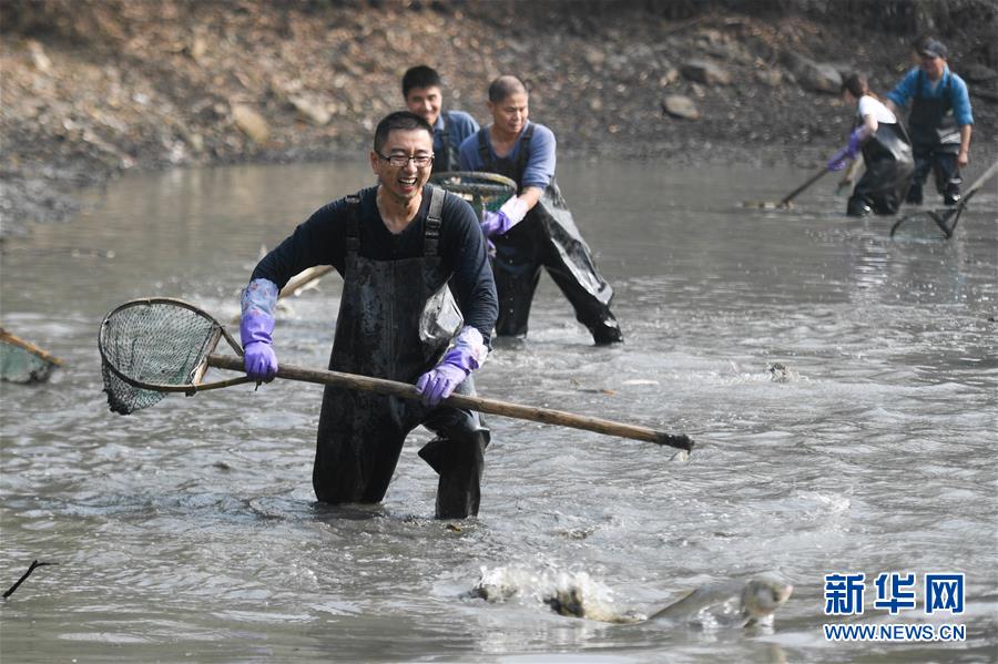 杭州:游客體驗(yàn)“干塘”捕魚