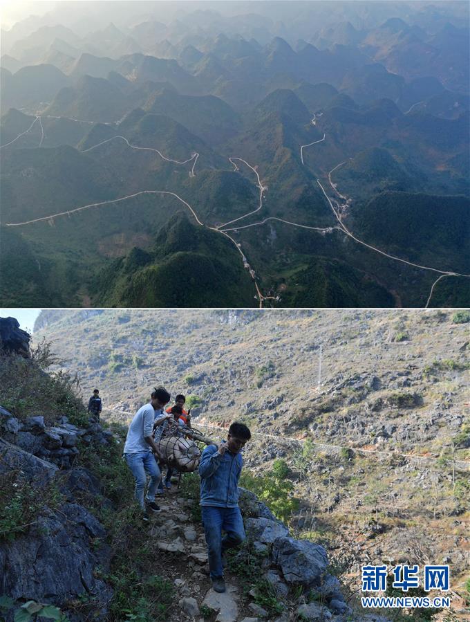 拼版照片:上圖為已經(jīng)通路的大化瑤族自治縣七百弄鄉(xiāng)弄雄村弄桃屯以及周邊村屯(11月10日無(wú)人機(jī)拍攝);下圖為在尚未通路的弄雄村弄桃屯,村民抬著準(zhǔn)備出售的土豬走在山路上(2016年12月8日攝)。新華社記者黃孝邦攝