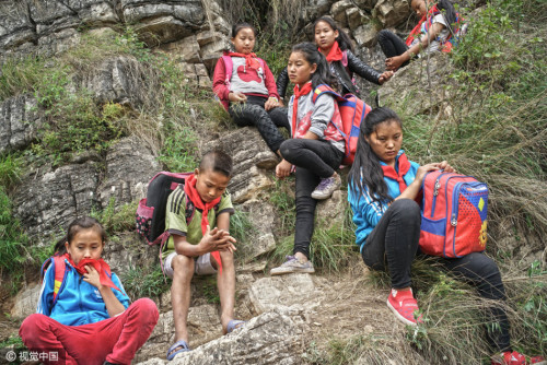 5月14日是家長接孩子的日子,清晨6點(diǎn)多,30多歲的陳古吉帶著背包繩和另外兩個家長一起下山接孩子。村里身手敏捷的年輕人,下山通常需要1小時,上山大約90分鐘,對于外來的人,通常是這個時間的兩倍。圖片來源:視覺中國