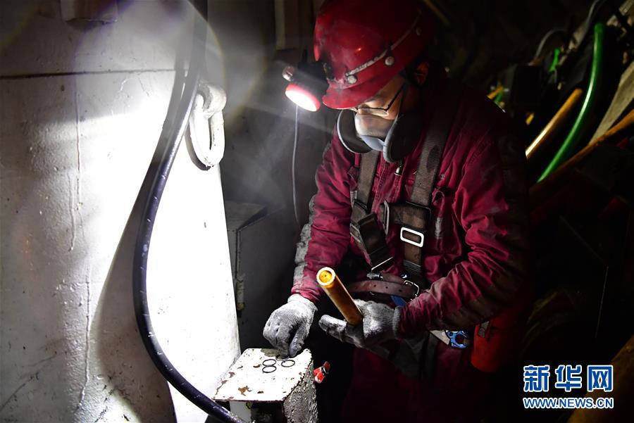 11月26日,在上灣煤礦12402綜采面內,工作人員準備更換液壓支架上的零部件密封圈。 新華社記者 邵瑞 攝