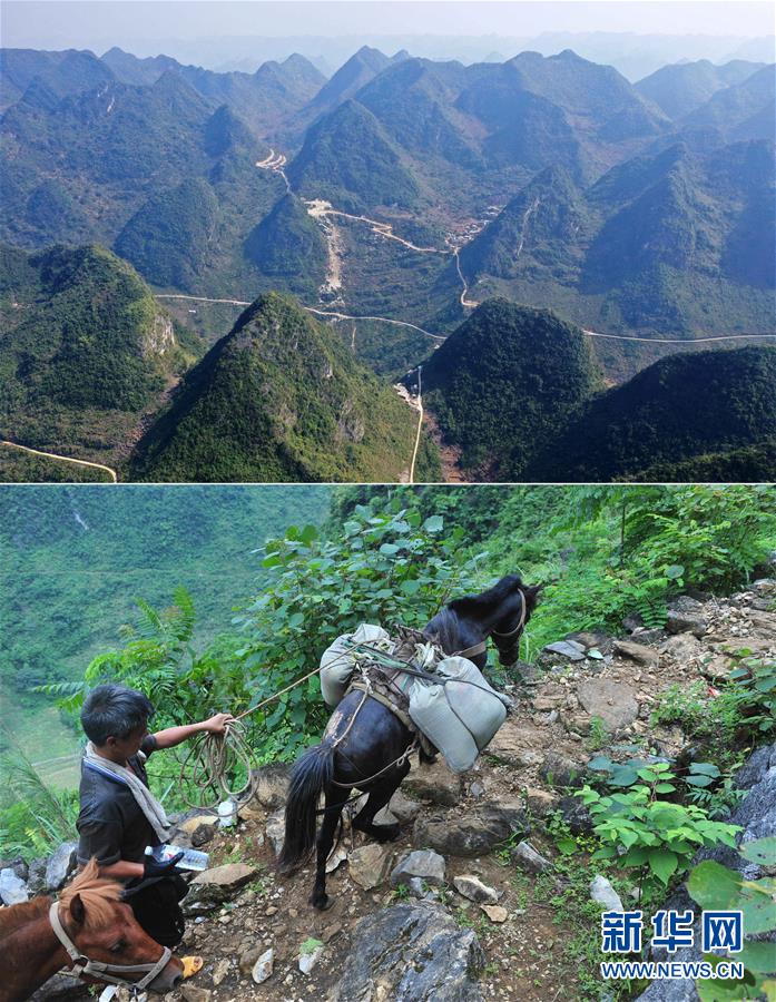 拼版照片:上圖為已經(jīng)修通公路的大化瑤族自治縣板升鄉(xiāng)弄勇村弄為屯以及周邊村屯(11月11日無人機拍攝);下圖為在弄勇村弄為屯,村民用馬將建筑材料馱回家,用于修建新房(2014年6月18日攝)。
