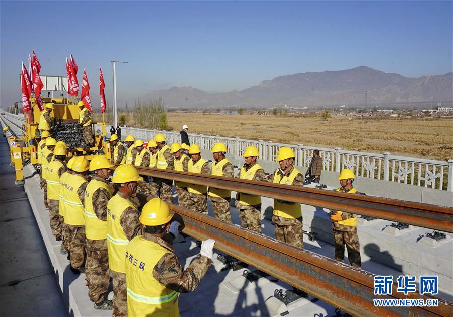 11月1日,中鐵三局的工人在京張高鐵河北懷來(lái)段鋪軌現(xiàn)場(chǎng)工作。