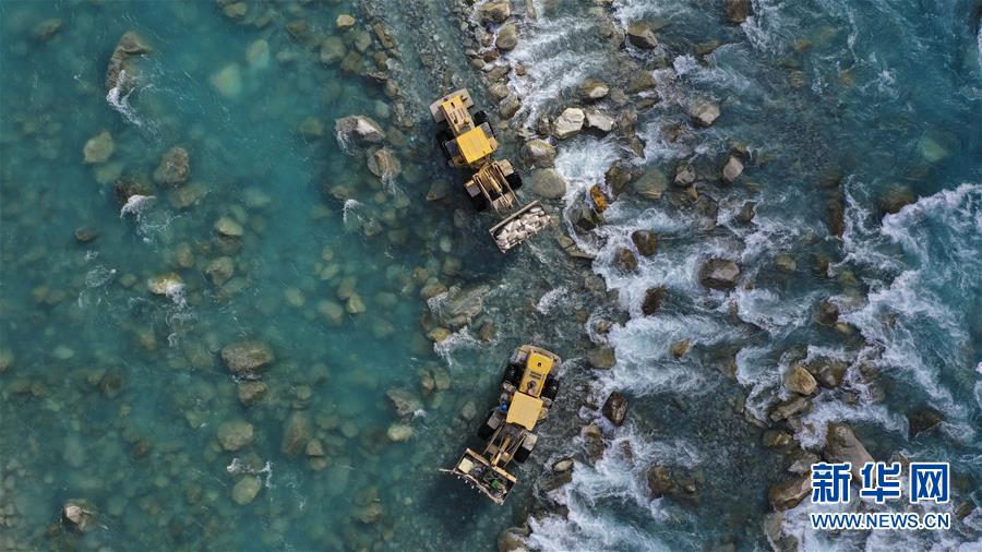 在新疆塔什庫爾干塔吉克自治縣大同鄉(xiāng)庫如克欄桿村,電力工人利用施工車輛運(yùn)送水泥、鐵塔零件過河,為鋪設(shè)線路做準(zhǔn)備(11月24日無人機(jī)拍攝)。