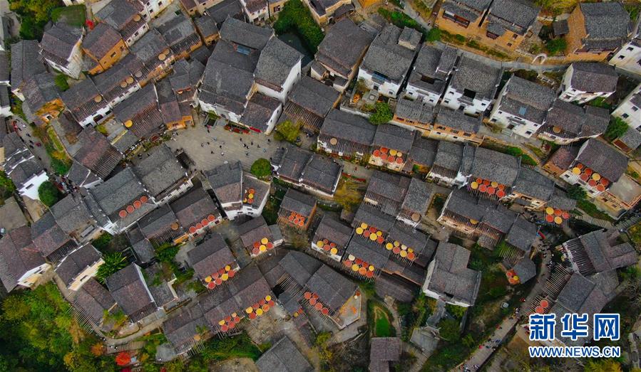 這是婺源縣江灣鎮(zhèn)篁嶺村的曬秋景象(11月7日無(wú)人機(jī)拍攝)。新華社記者胡晨歡攝