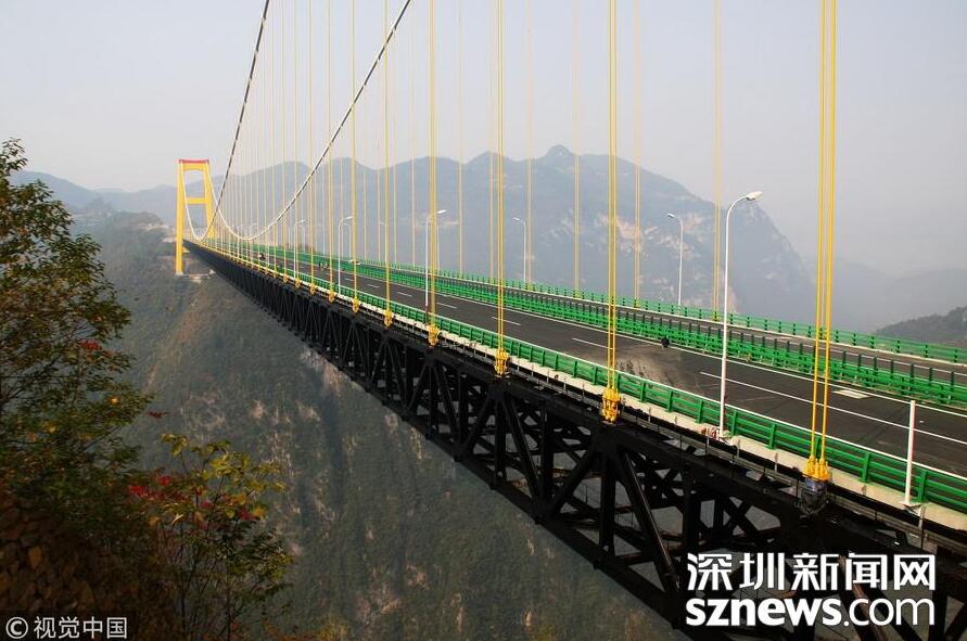 【世界第一高懸索橋——四渡河大橋】四渡河特大橋位于巴東縣野三關(guān)鎮(zhèn)四渡河,大橋主跨900米,橋面與峽谷谷底高差達(dá)560米,相當(dāng)于200層樓高,是目前國(guó)內(nèi)在深山峽谷里修建的最大跨度懸索橋,比目前世界最高橋法國(guó)米約大橋還要高290米,被譽(yù)為世界第一高懸索橋。