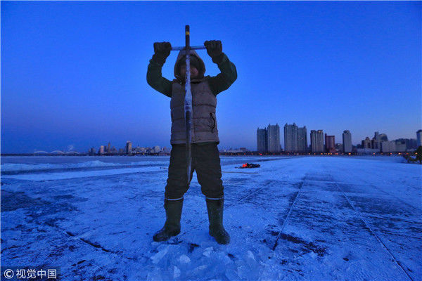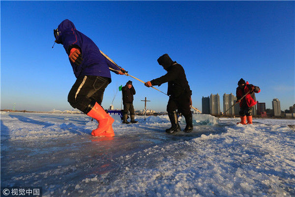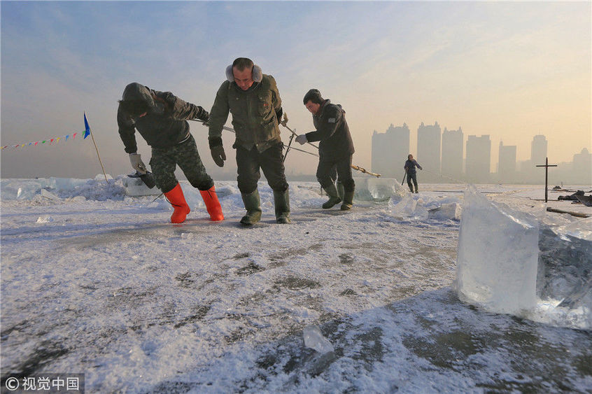 2018年12月11日,黑龍江省哈爾濱市,松花江上,采冰者們彎腰拉繩,宛如纖夫般拽重達半噸的冰塊出水。采冰者都是自哈市江北萬寶、東發(fā)、沙陀子等鄉(xiāng)鎮(zhèn)的農民,他們每年冬閑時都會親屬、村鄰之間結伴到松花江畔采冰,有的采冰人,已經連續(xù)干了二十多年。每個采冰季,他們每天要在冰面上工作10-12個小時,每個采冰組,一天要拽出冰塊2000-3000塊,一個近20天的采冰季,每人能收入近萬元。視覺中國
