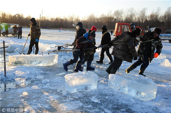 2018年12月8日,最低氣溫零下22度,哈爾濱市江北公路大橋東側的江面上,工人們正在從江中撈取冰塊,裝車運往景區(qū)制作冰燈、冰雕?,F(xiàn)場,工人先是用電鋸、鐵釬將冰分割成半米多寬,一米多長的冰塊,接著將其拉出水面。等候在旁的叉車上前,將冰裝上運冰的卡車,之后裝滿冰塊的卡車駛往景區(qū)。