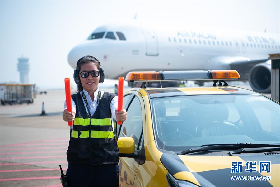 11月25日,澳門國際機(jī)場營運(yùn)員鄧祺君在機(jī)場指揮飛機(jī)停泊,她已經(jīng)工作了3年。 新華社記者 張金加 攝