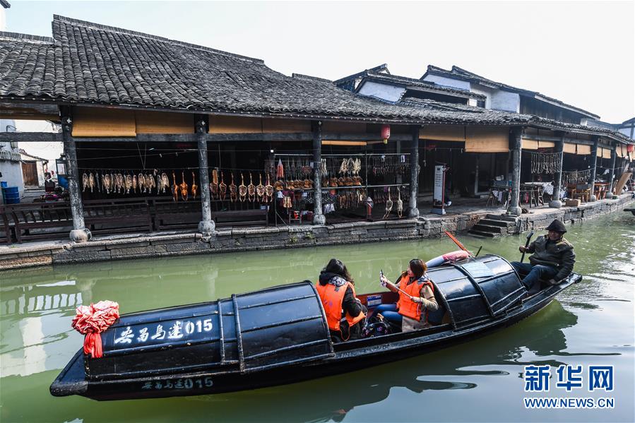 12月3日,安昌古鎮(zhèn)的河邊曬滿了各種手工制作的紹興臘味。新華社記者徐昱攝