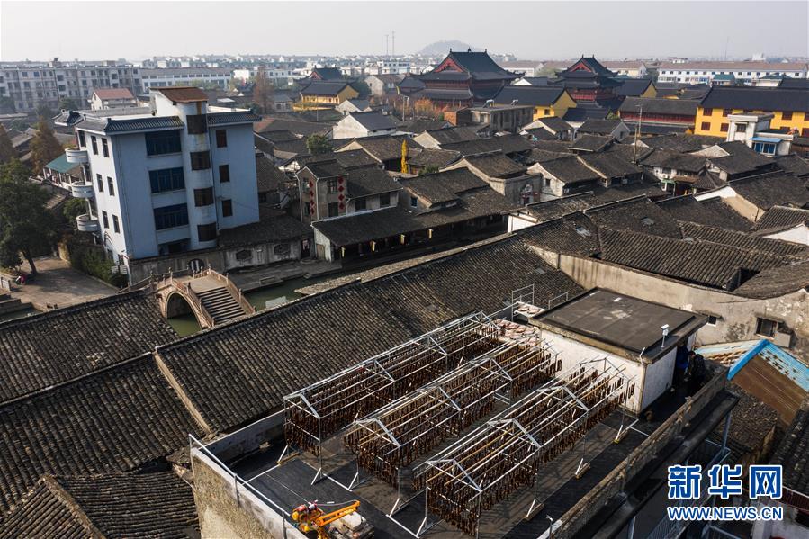 12月3日,安昌古鎮(zhèn)傳統(tǒng)臘味作坊里曬滿了各種手工制作的紹興臘味(無(wú)人機(jī)拍攝)。新華社記者徐昱攝