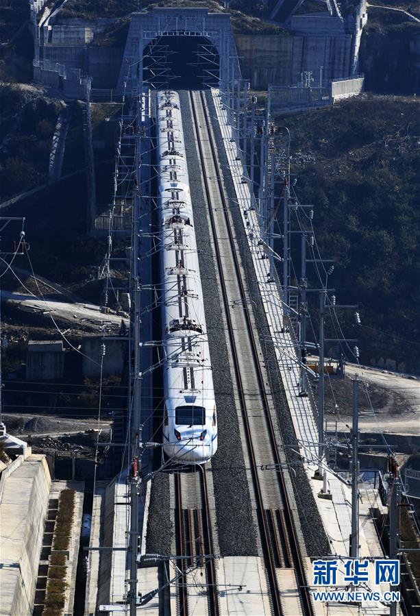 12月15日,一列試驗列車行駛在貴州清鎮(zhèn)市境內(nèi)的成貴高鐵線上。成(都)貴(陽)高鐵預計于12月16日全線正式開通運營。成貴高鐵線路全長650公里,是我國“八縱八橫”高速鐵路網(wǎng)的重要組成部分,設(shè)計時速為250公里。新華社記者楊文斌攝