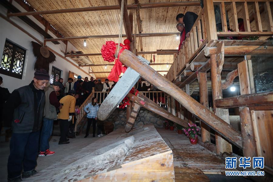 12月15日,油坊中的水車帶動(dòng)大木棰砸碎茶籽。 新華社記者 徐昱 攝